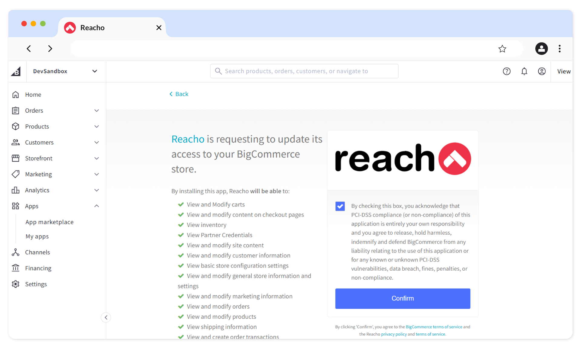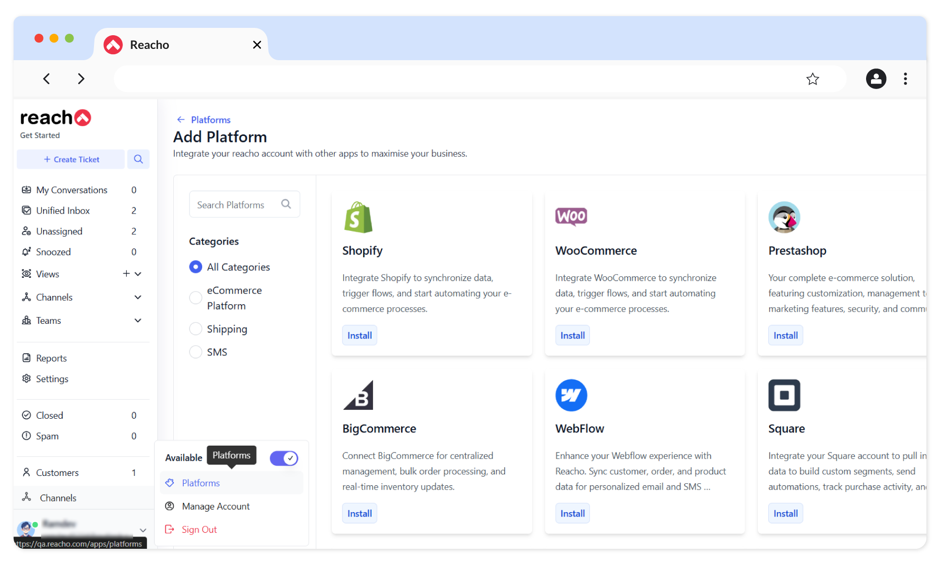 1. Log in to Reacho, go to Platforms and install BigCommerce.