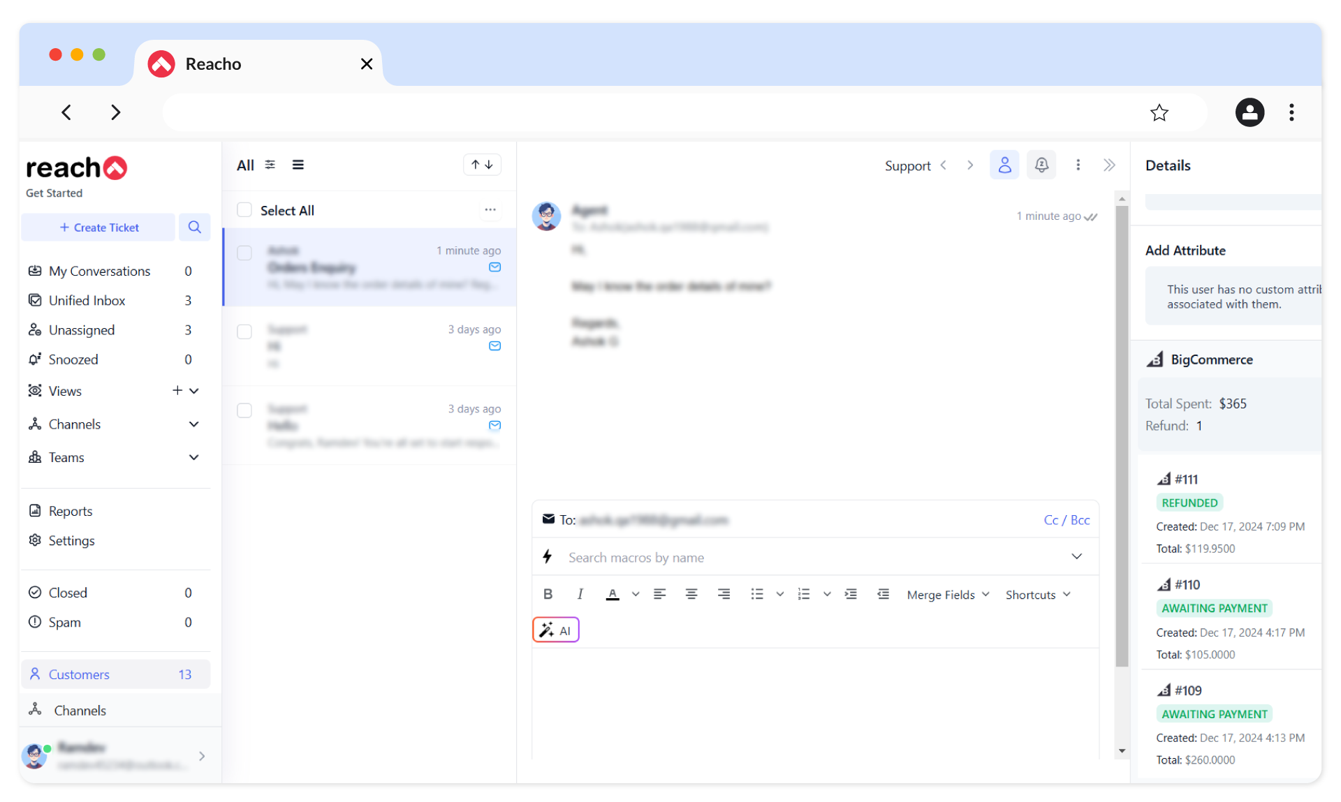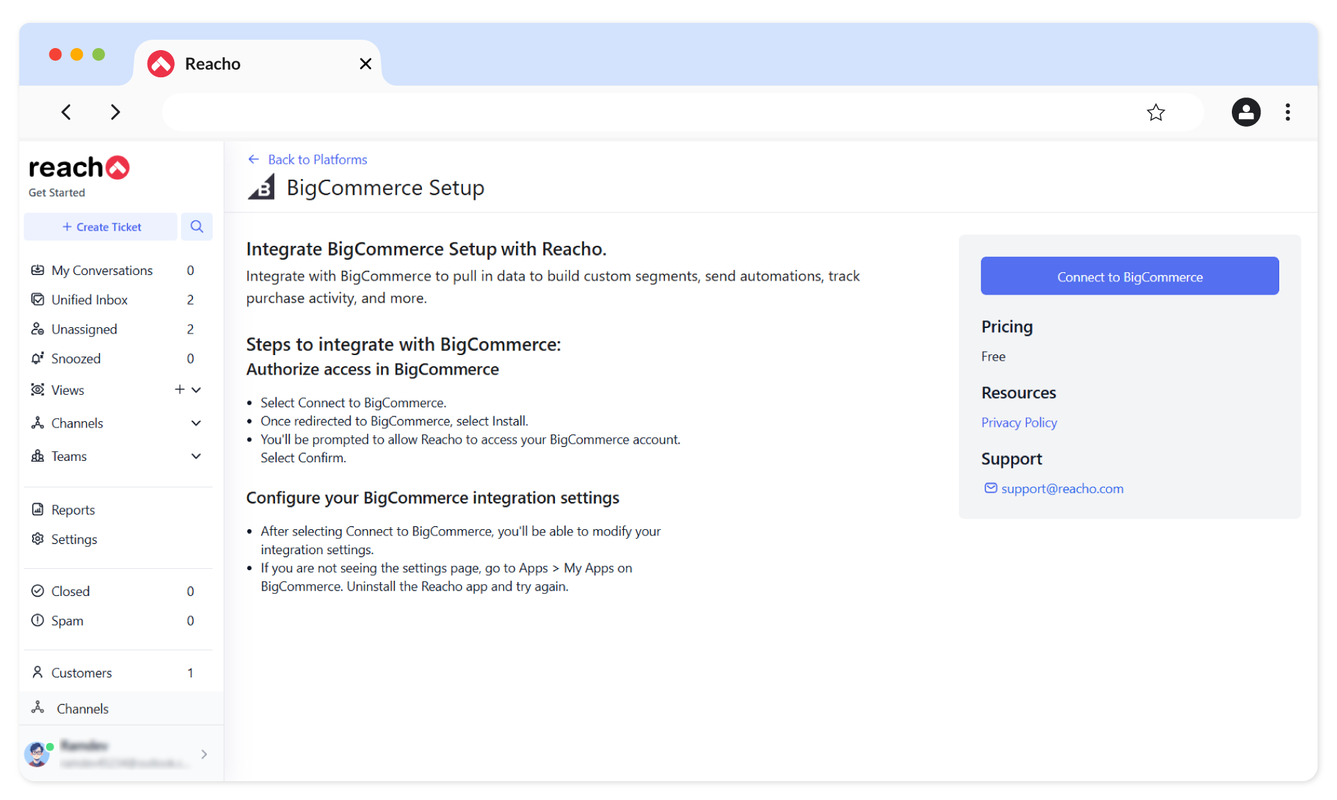 Once set up, customer contacts and order history from BigCommerce will sync automatically with Reacho, enhancing order management and customer support capabilities.