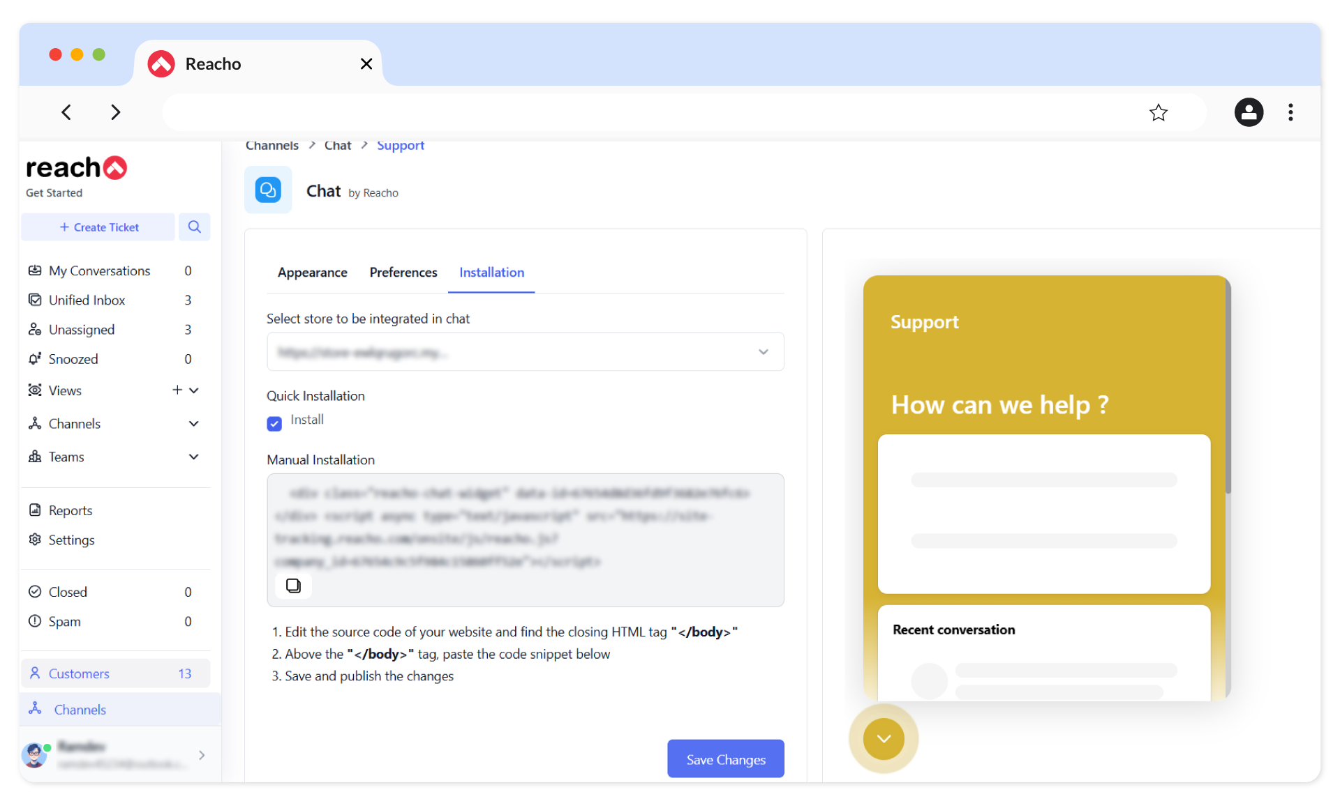 3. Configure the chat widget in the Appearance, Preferences, and Installation tabs.