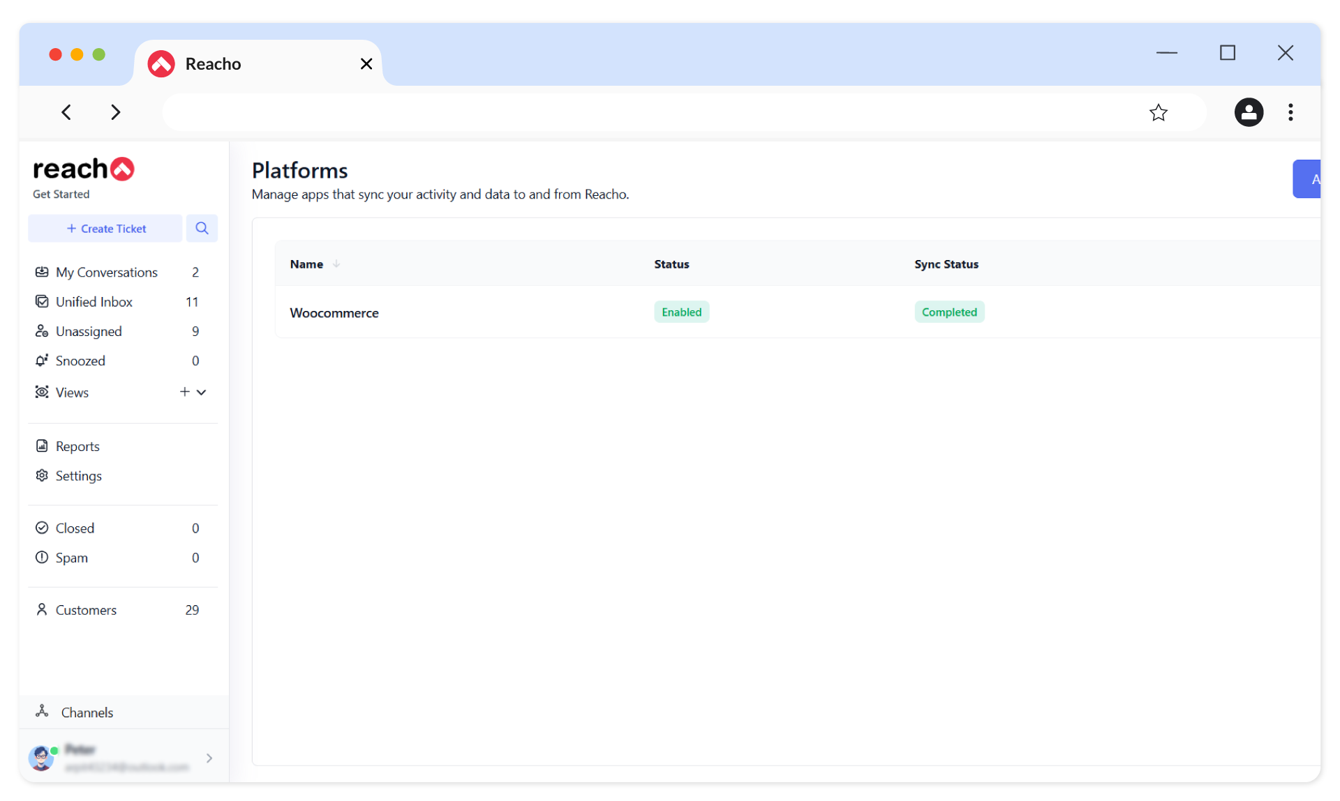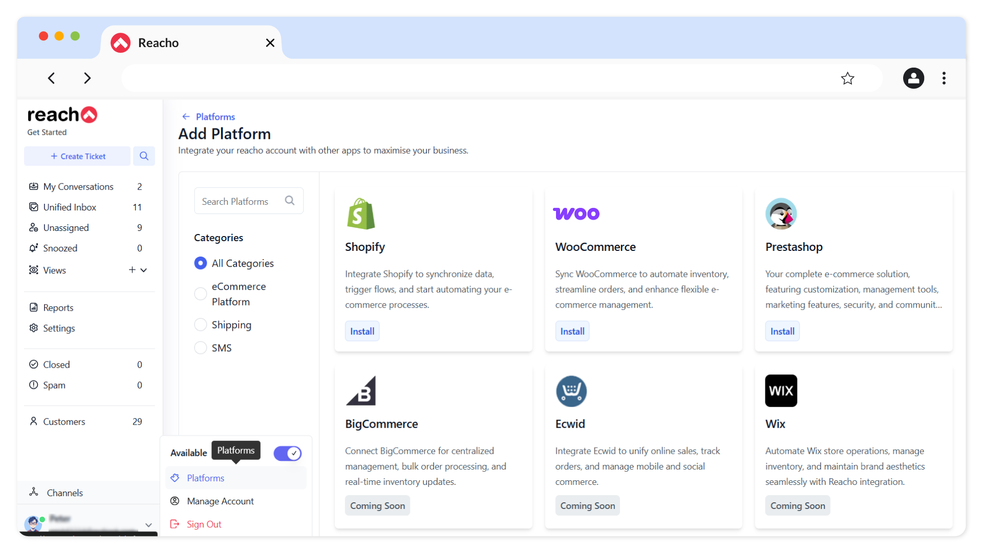 1. Log in to Reacho, go to the Platforms section, and install WooCommerce by clicking on the Add Platforms button.