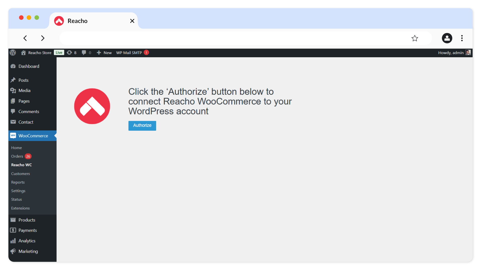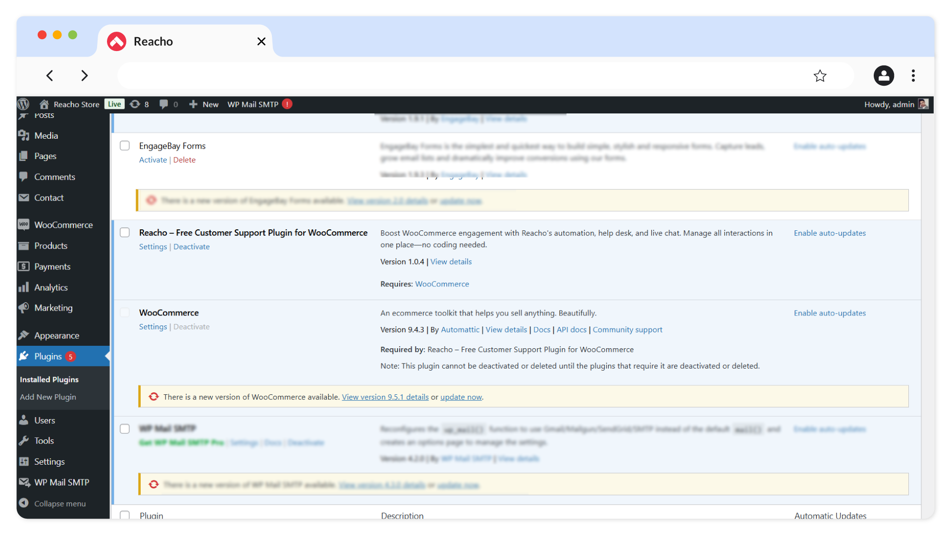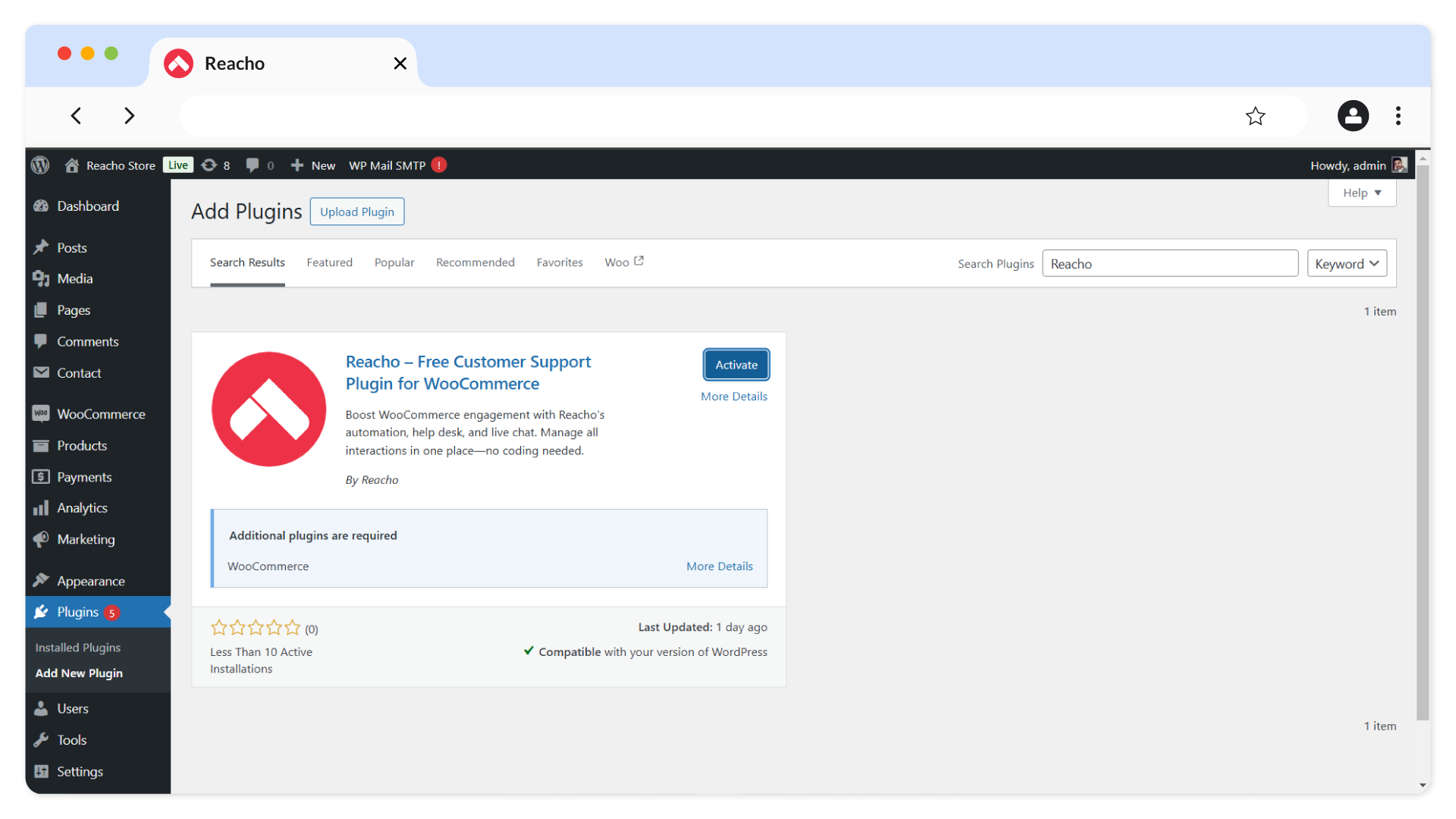 7. Click on Activate once the installation is complete. After doing this, the Reacho plugin will be available for WooCommerce.