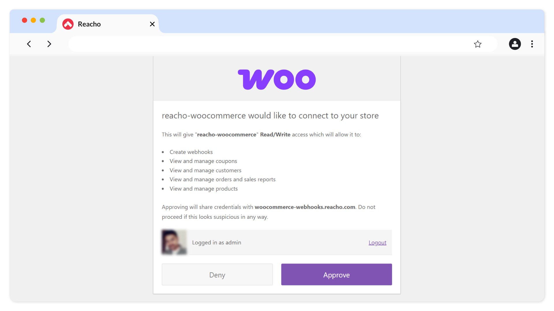 10. Click Approve to finalize the connection between Reacho and WooCommerce.