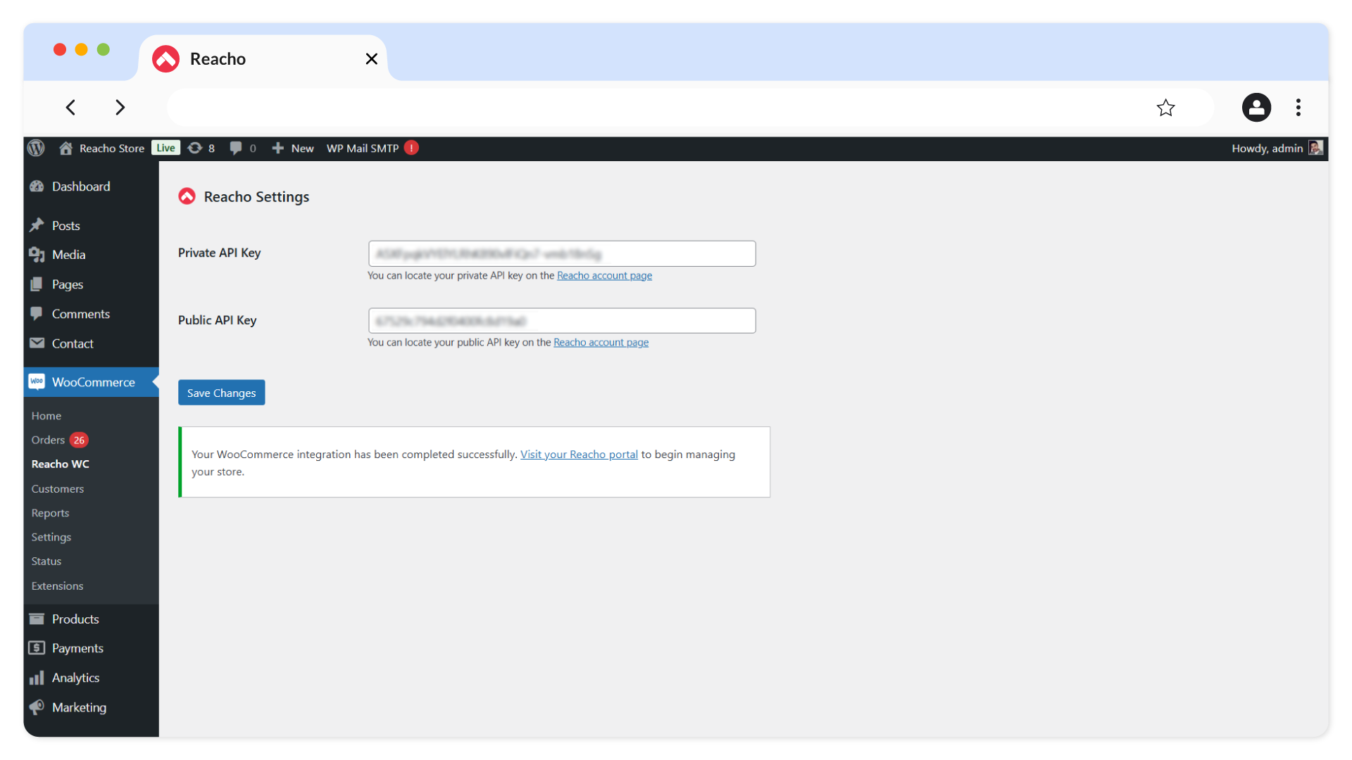 11. Enter your Public and Private API Keys from Reacho → Manage Account → API Keys section, then click Save Changes.